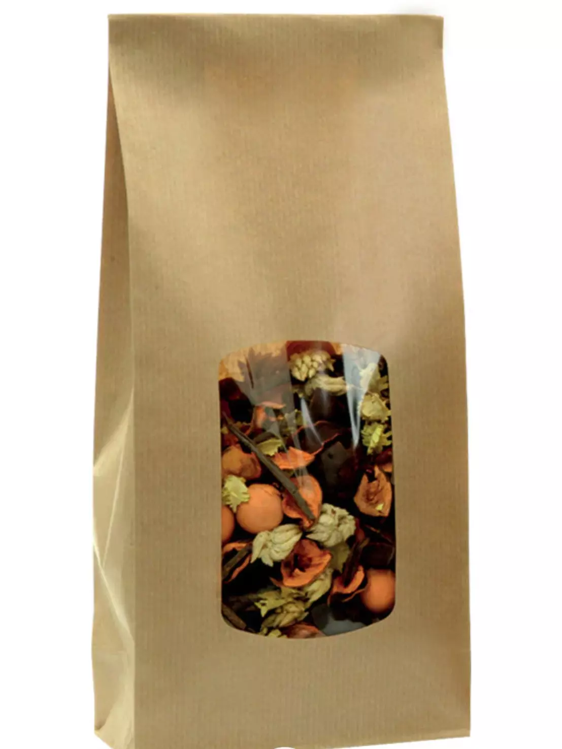 Utiliser uniquement pour aliments secs. Éviter contact prolongé avec la graisse ou l’humidité qui pourrait affaiblir le kraft. Remplir en veillant à ce que la fenêtre reste visible. Stocker les sacs à l’abri de l’humidité. Recycler le kraft selon les filières papier et le film PP s’il est séparé ou selon les consignes locales.