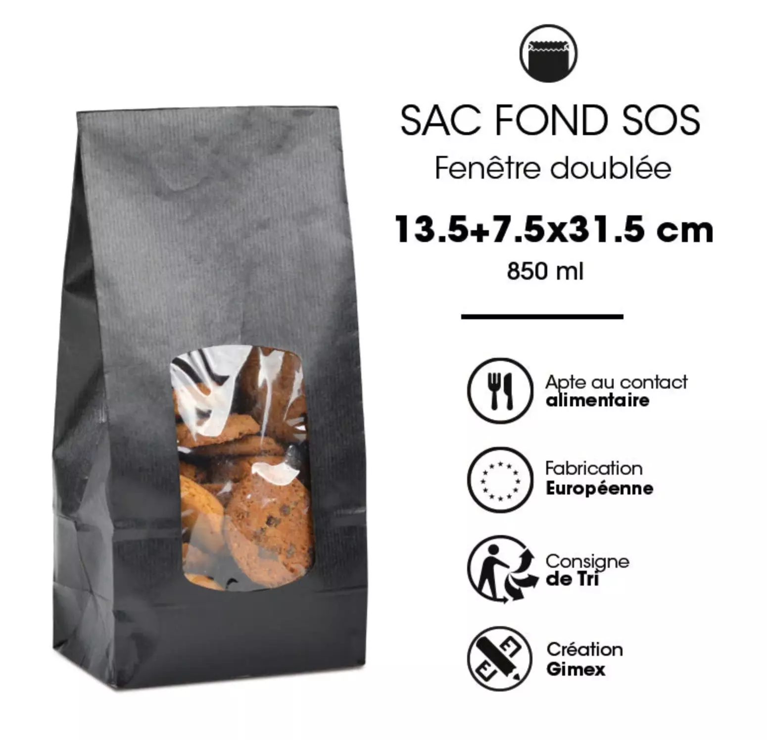 Le sac **23204** est un sac fond SOS avec fenêtre avant, conçu pour mettre en valeur vos produits secs vendus en vrac. Fabriqué en kraft noir de qualité vergé, avec une épaisseur de 90 g, il offre une belle tenue et une apparence premium. La face avant dispose d’un film en polypropylène qui permet de voir le contenu du sac. Le sac est sous-conditionné par paquets de 100 sous film protecteur pour préserver la qualité. Référence apte au contact alimentaire pour aliments secs uniquement.