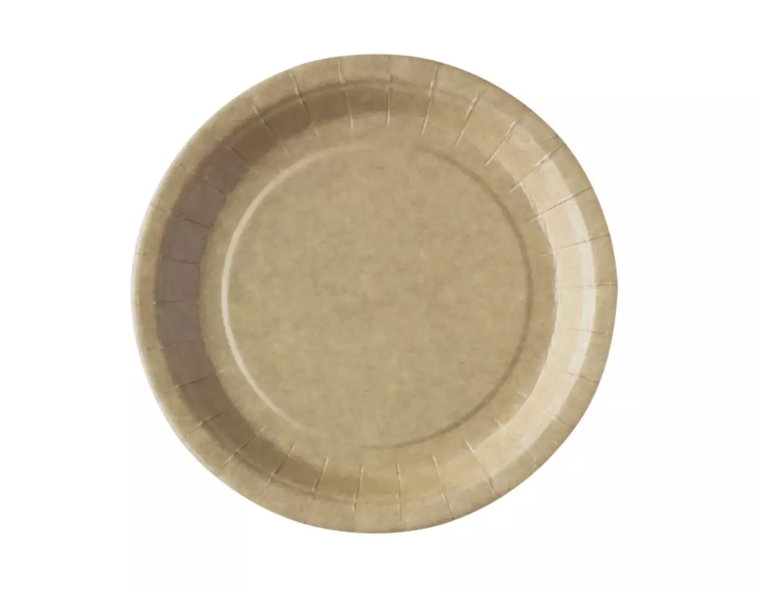Lot d’assiettes rondes en kraft biodégradable de ∅ 23 cm, conditionnées par 9 × 50 pièces (soit 450 assiettes), coloris naturel kraft.