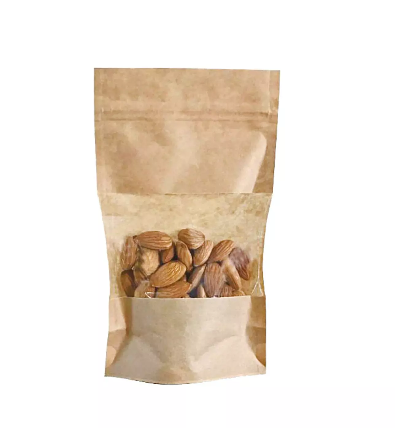 La référence **23012** désigne un sachet Doypack en kraft brun, idéal pour la vente en vrac. Il est doté d’une fermeture à glissière hermétique et d’une fenêtre transparente sur le devant, permettant de valoriser visuellement vos produits. Fabriqué à partir de kraft brun de 40 g/m², entièrement doublé d’un film polypropylène orienté (PP orienté) de 40 µ, répondant aux exigences de contact alimentaire pour produits secs ou gras. Conditionné en carton de **900 unités**, avec un conditionnement intermédiaire en paquets de 100 sous film protecteur.