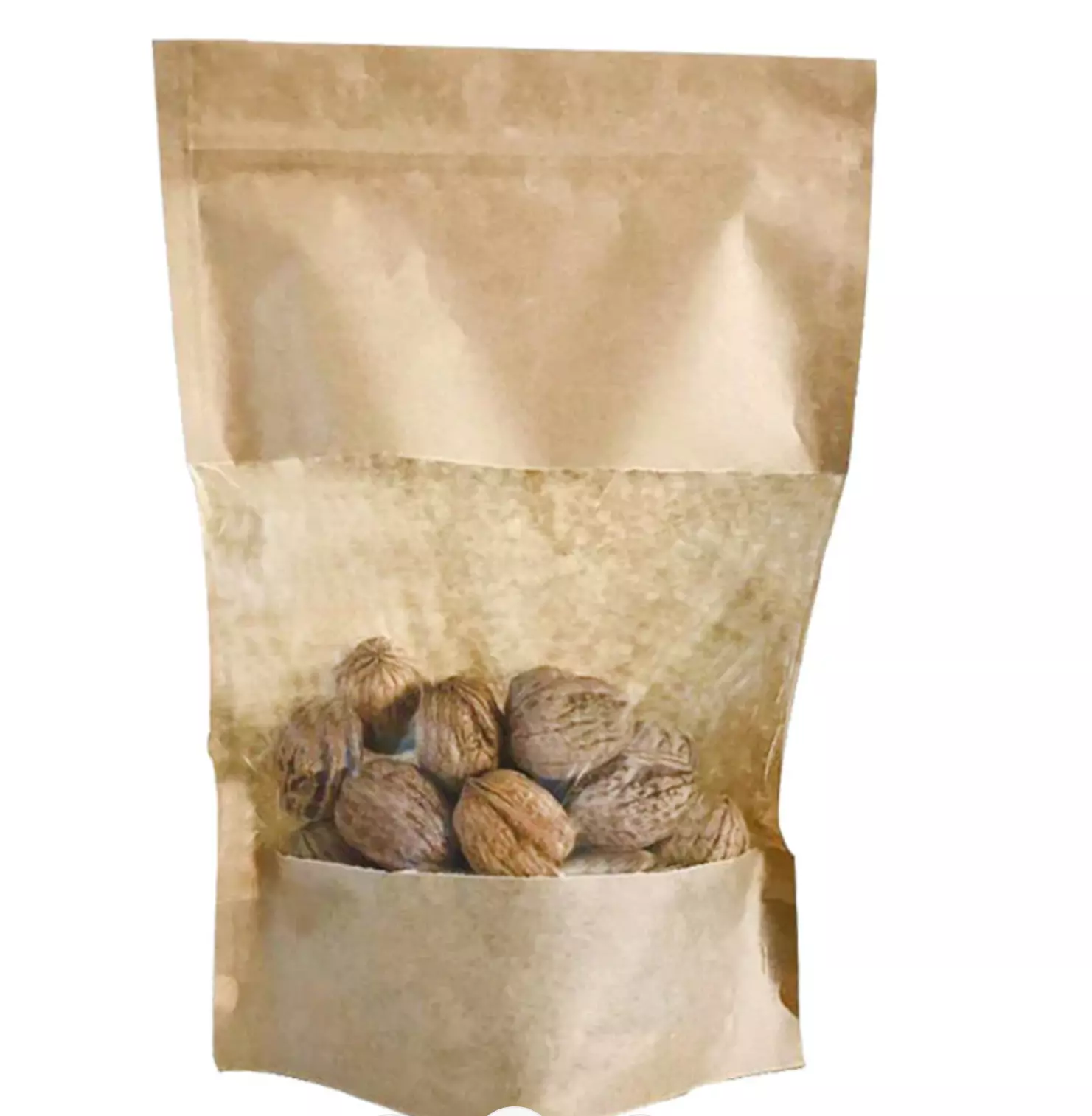 Sachet doypack alimentaire 1300 ml en kraft brun de 40 g, avec fenêtre transparente frontale et fermeture zip hermétique. Conditionné par lot de 400 unités.