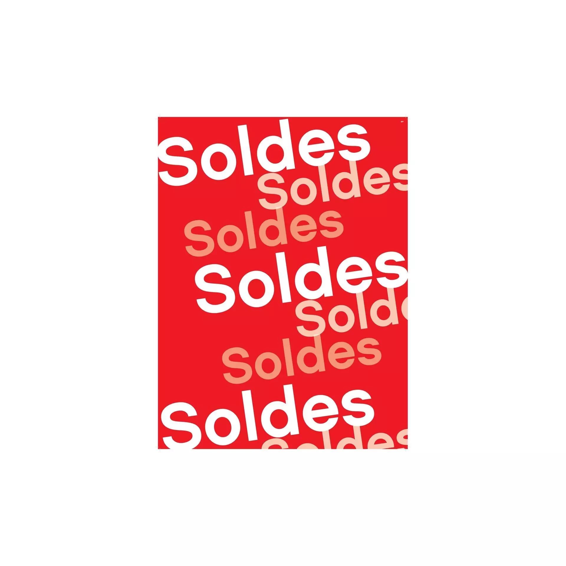 Lot de 12 affiches verticales 60 × 80 cm, fond rouge avec impression blanche répétée du mot « SOLDES ». Idéales pour la mise en valeur promotionnelle en vitrine ou à l'intérieur du magasin.