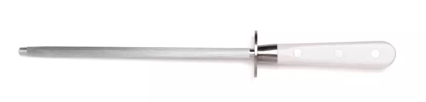 Affûteur type chaira (métal + pierre) de 205 mm de longueur utile avec finition “blanco inox”, manche en ABS plastic blanc, longueur totale 32,50 cm, conçu pour affûter et entretenir les lames de couteaux professionnels.