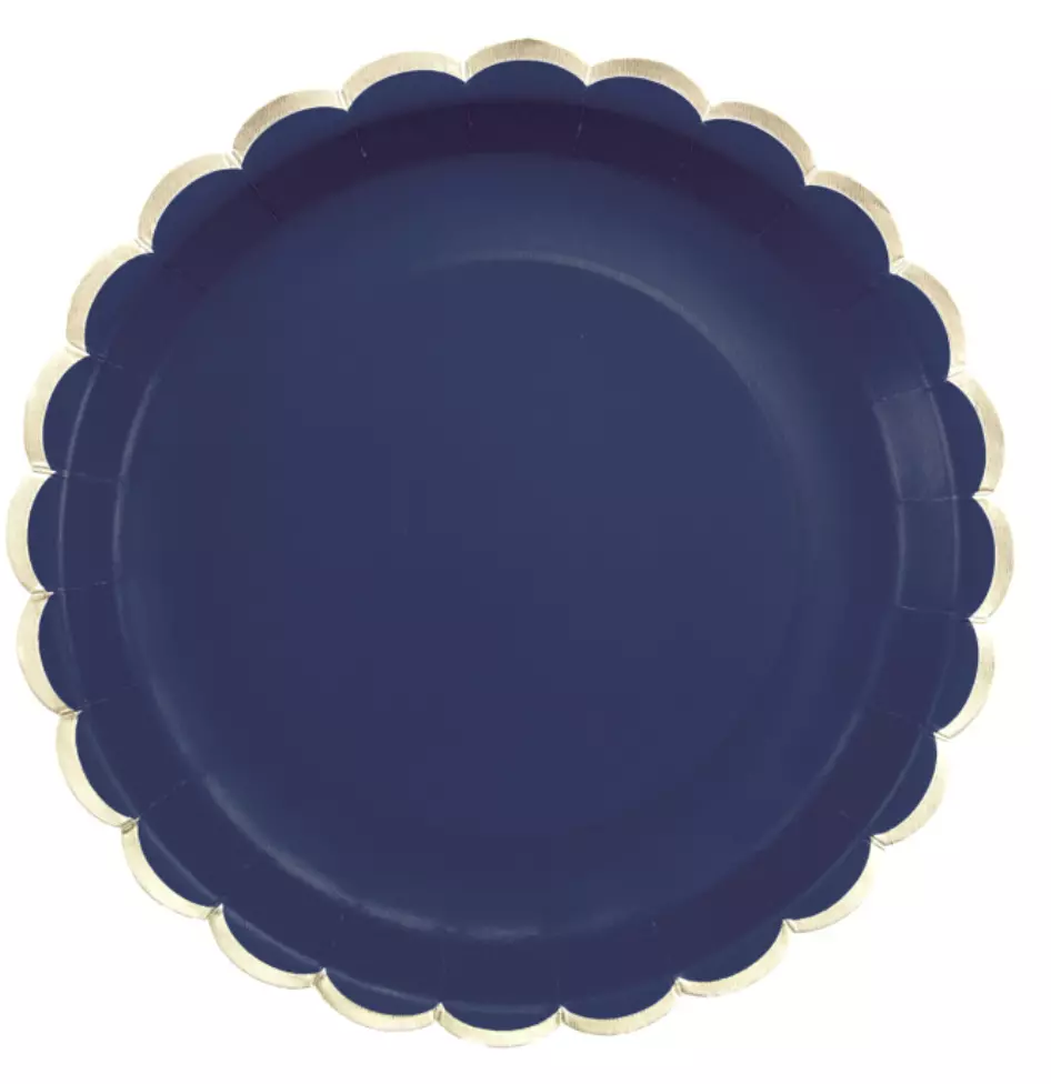 Jolies assiettes 350gr festonnées bleu marine avec un galon or, diamètre 23cm.