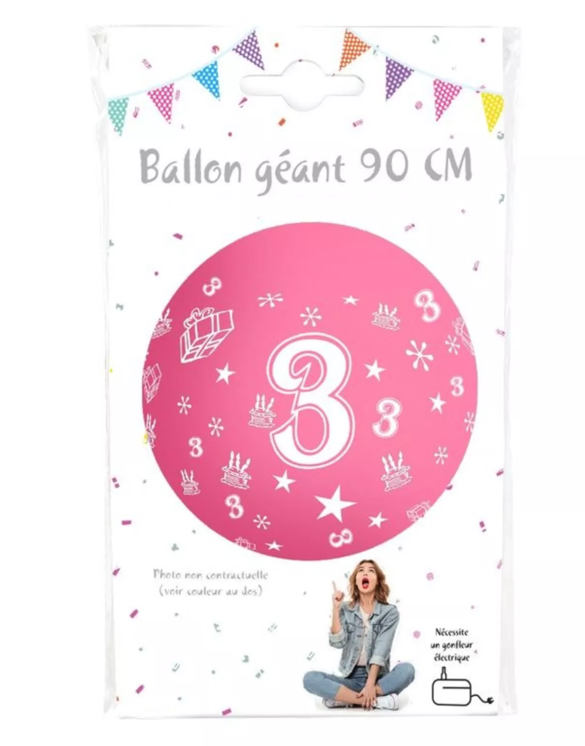 Le ballon **36377** est un ballon géant en latex imprimé du chiffre « 3 », d’un diamètre d’environ 90 cm. Il est proposé dans des couleurs aléatoires pour apporter une touche festive et surprenante. Il peut être gonflé à l’air ou à l’hélium selon l’usage souhaité.