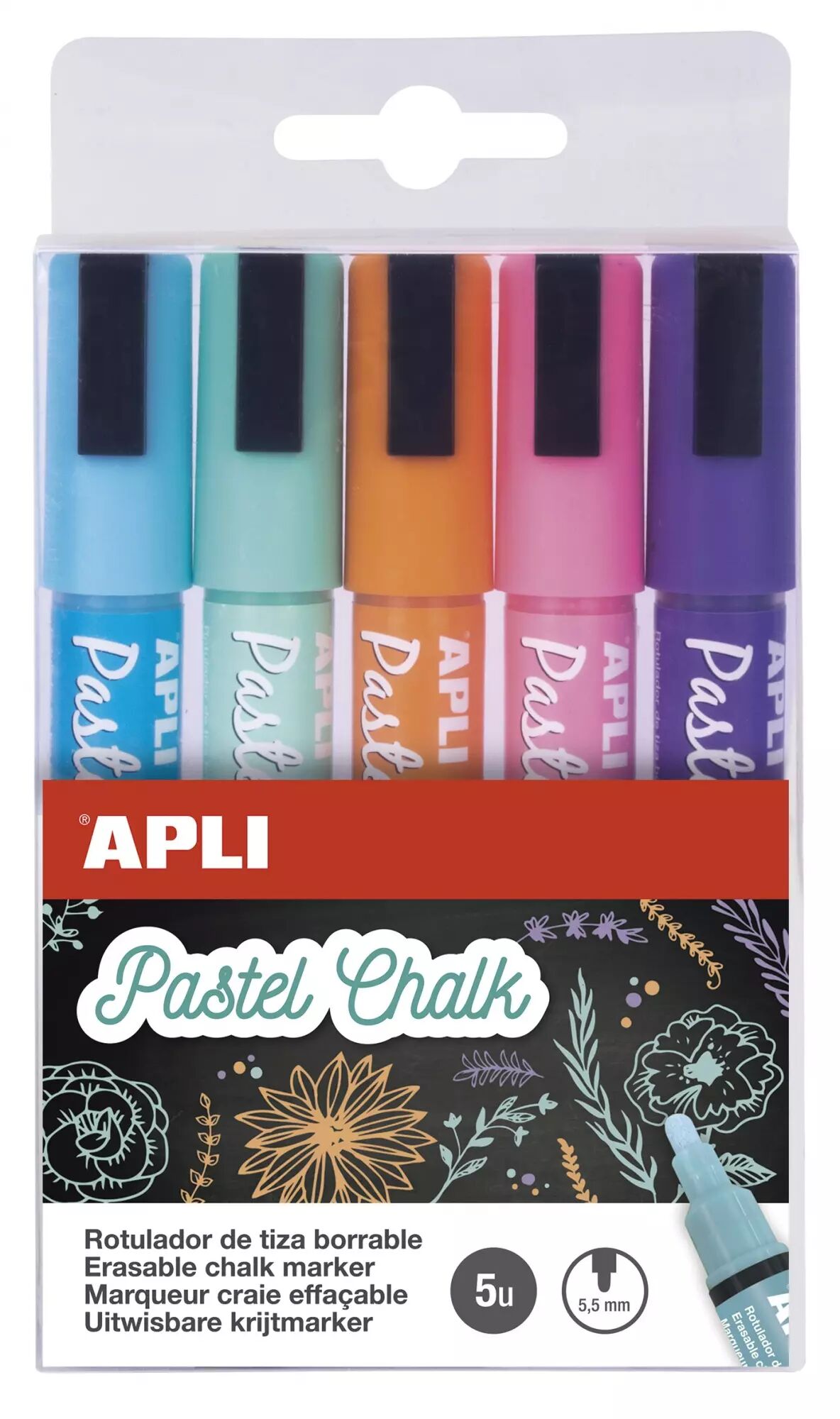 Boîte de 5 marqueurs craie liquide avec pointe ronde de 5,5 mm de diverses couleurs terre : marron, orange, jaune, vert et bleu. Idéal pour écrire au tableau, sur du plastique, des fenêtres, étiquettes de tableau, panneaux brillants, miroirs, céramique, vinyls, métal etc.