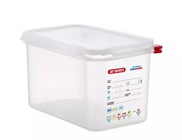 Le conteneur hermétique Araven GN 1/4 de 4,3 L allie une capacité généreuse à un design fiable pour une conservation idéale des préparations en cuisine professionnelle. Sa hauteur de 150 mm optimise le stockage tout en garantissant une étanchéité renforcée pour prolonger la fraîcheur.