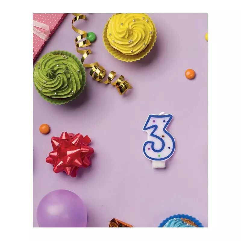 Bougie décorative en forme du chiffre “3”, hauteur adaptée pour gâteau d’anniversaire, montée sur pic pour insertion facile sur gâteau.