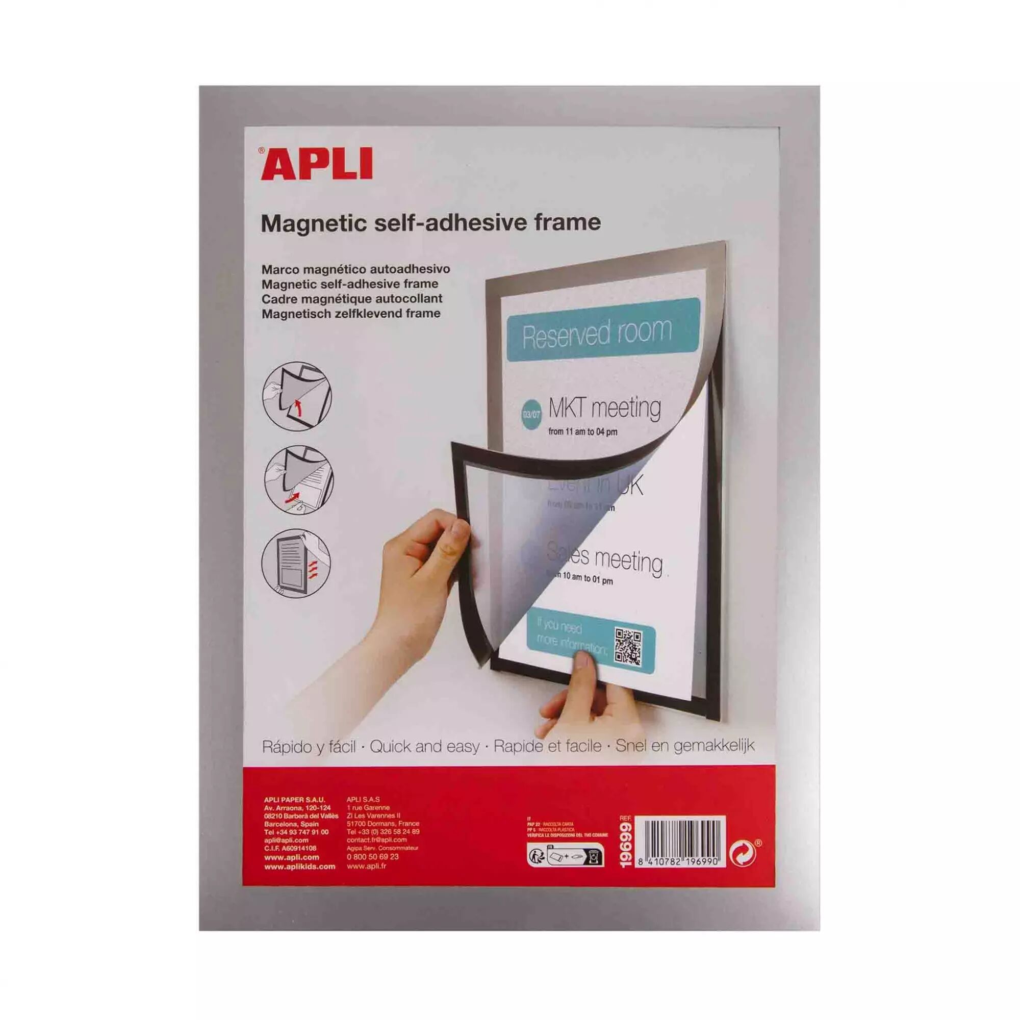 Cadre d'affichage magnétique adhésif adapté aux feuilles A4 qui permet d'afficher des documents ou des images importants.