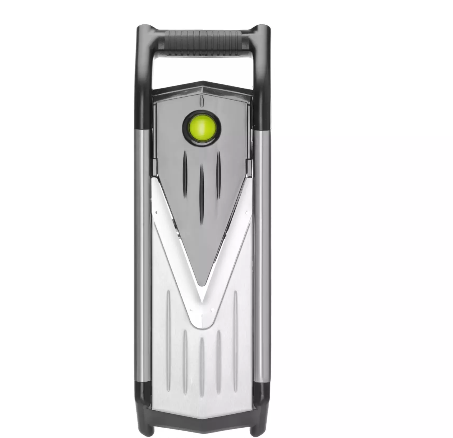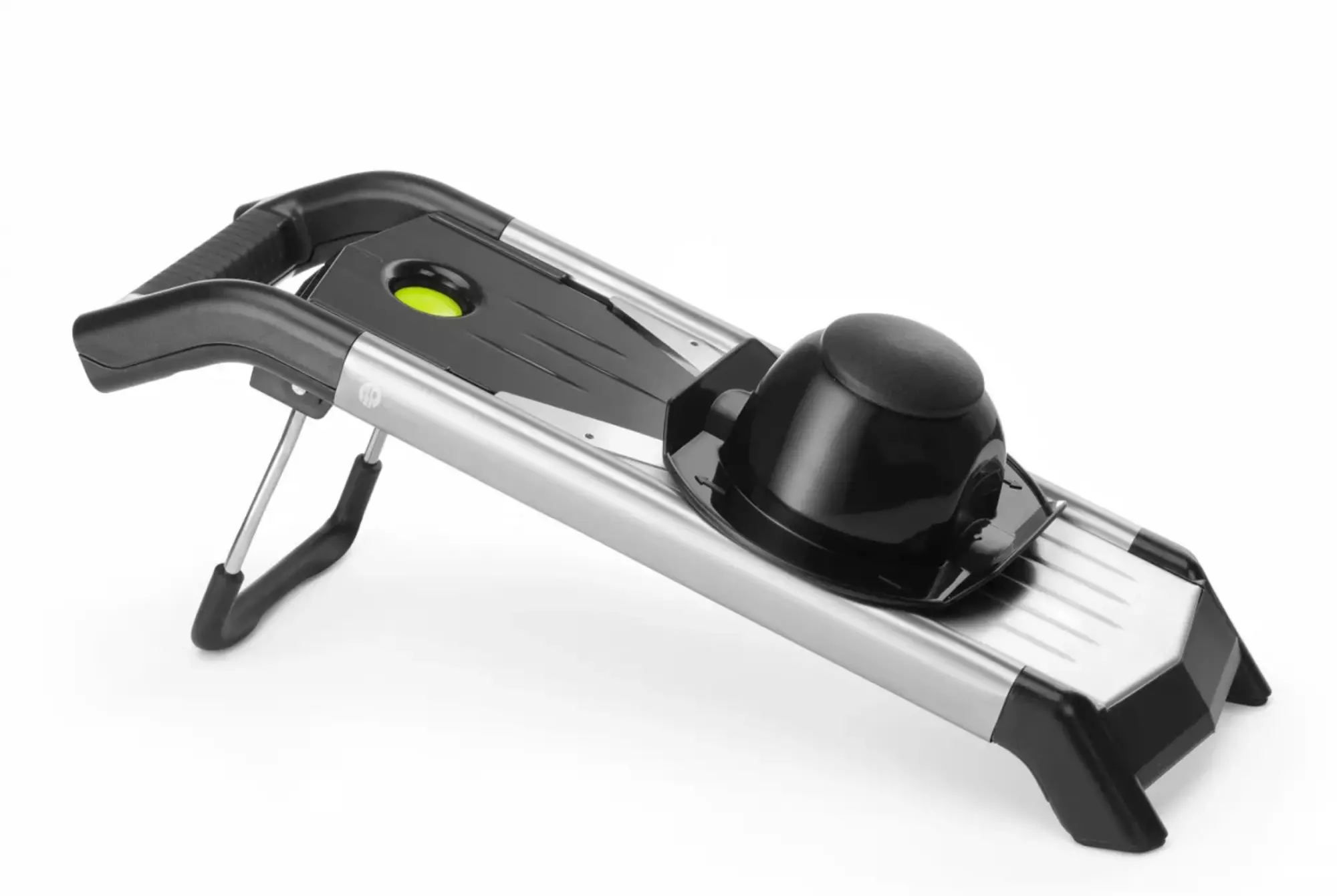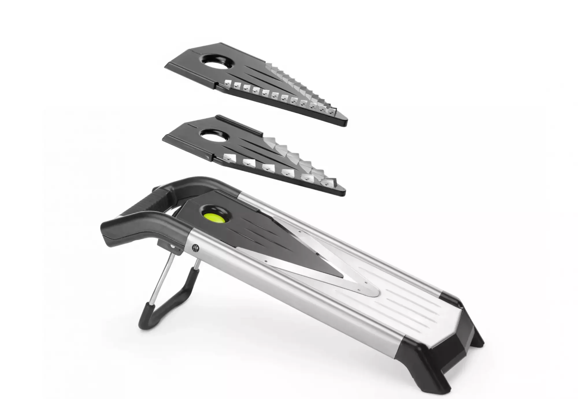 Mandoline robuste au design ergonomique, en acier inoxydable AISI 304 et ABS, avec pieds antidérapants rétractables, et 5 inserts interchangeables pour découpe en tranches ou julienne.
