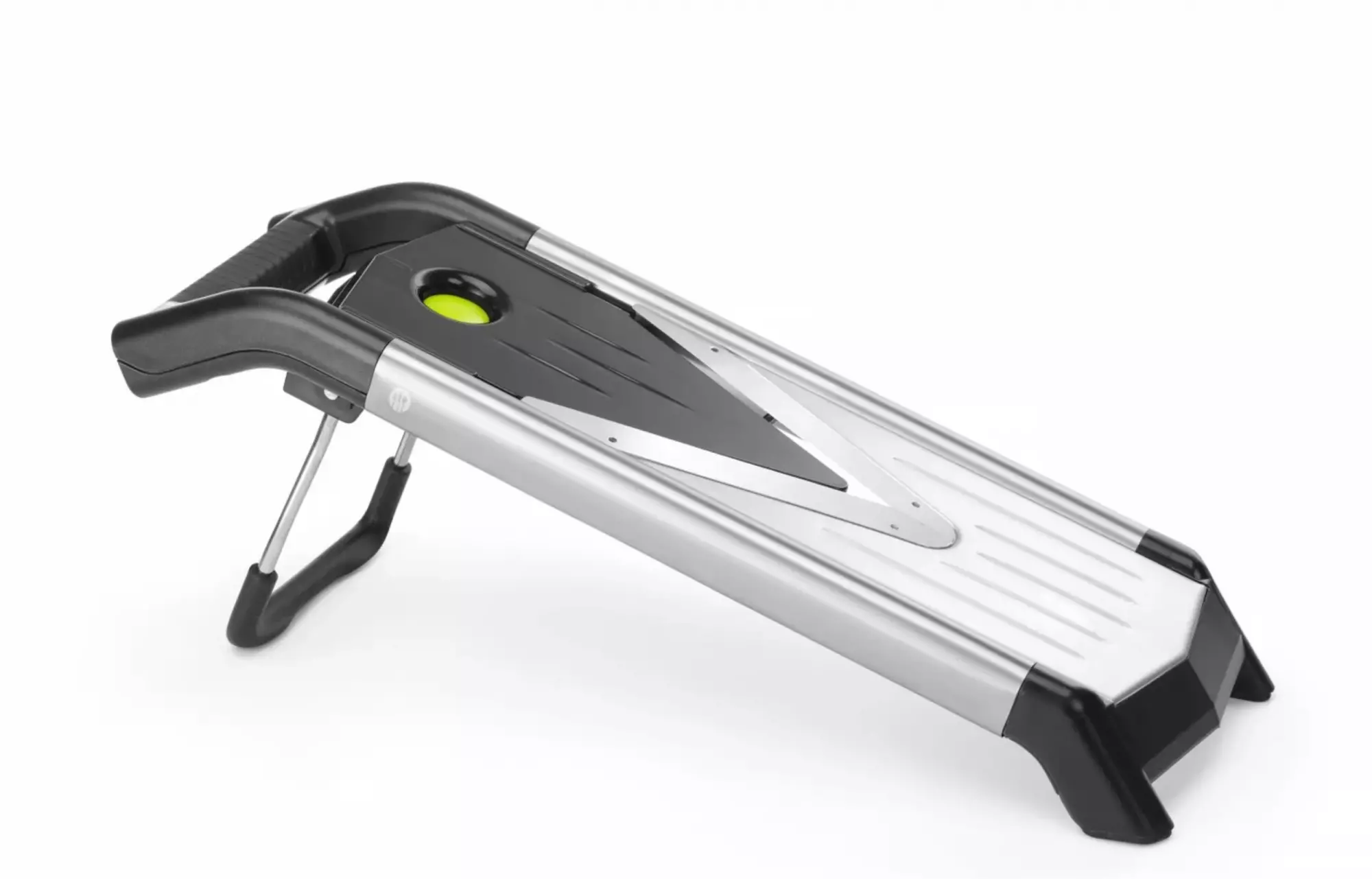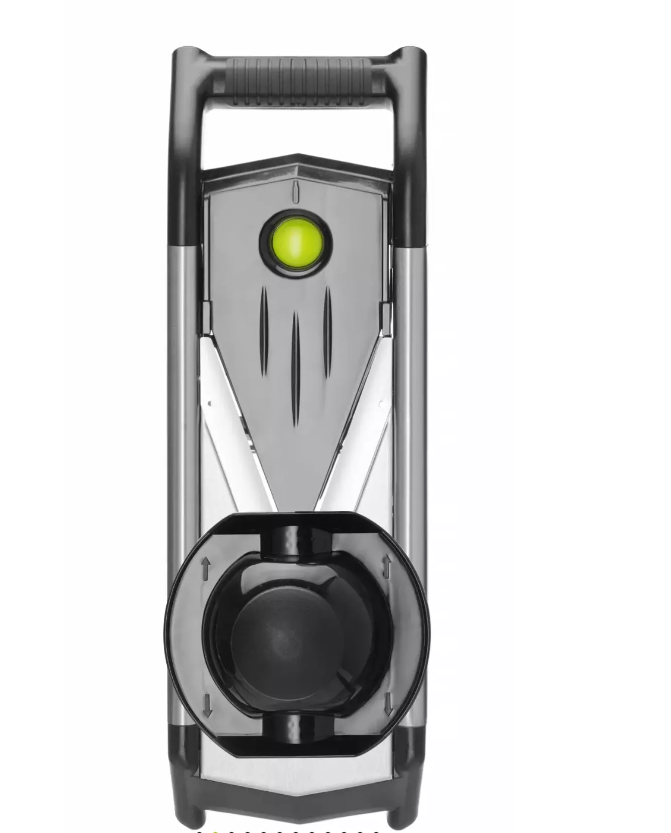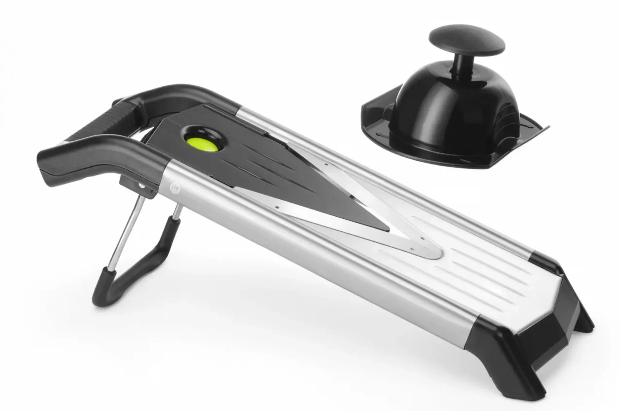 Mandoline robuste au design ergonomique, en acier inoxydable AISI 304 et ABS, avec pieds antidérapants rétractables, et 5 inserts interchangeables pour découpe en tranches ou julienne.