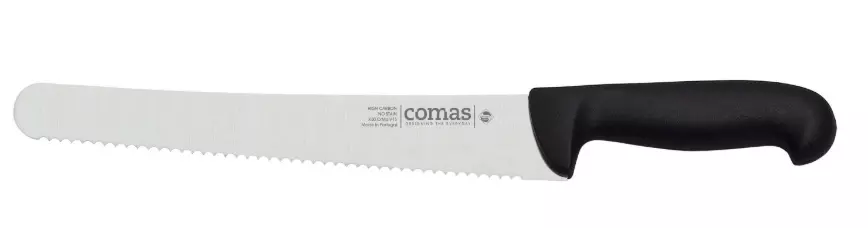 Couteau robuste en acier inoxydable avec manche noir, lame crantée de 2,5 mm, longueur totale 37 cm — conçu pour la découpe de pains, viennoiseries et pâtisseries.