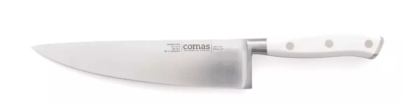 Couteau de cuisine professionnel de 200 mm, lame en acier inoxydable 420, manche ABS blanc, finition satinée — idéal pour trancher avec précision.