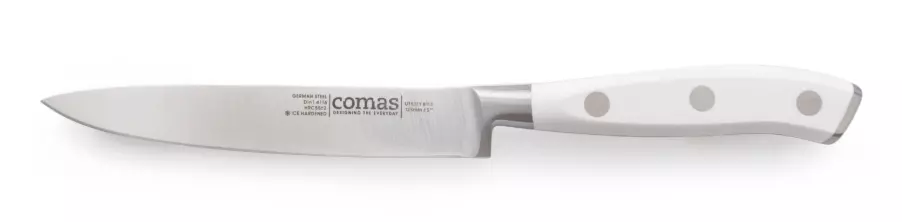 Couteau de cuisine polyvalent, lame 125 mm en acier inox 420, manche en ABS blanc, fini satiné, longueur totale 230 mm, idéal pour découper légumes et usages quotidiens.