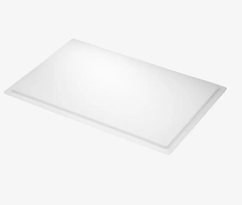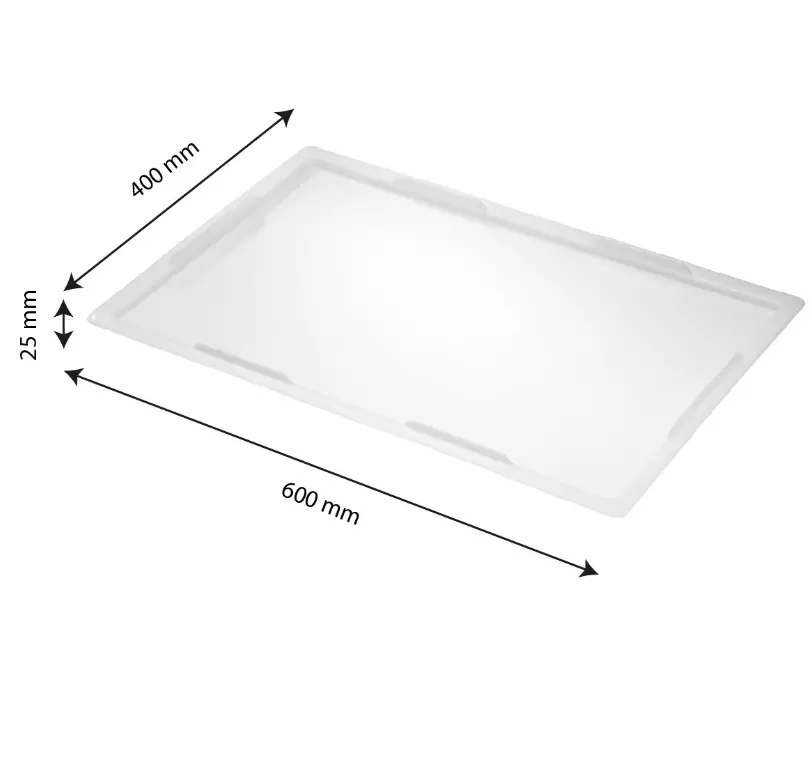 Couvercle en PEHD blanc sans bisphénol A, dimensions 600 × 400 × 25 mm, poids 0,71 kg.