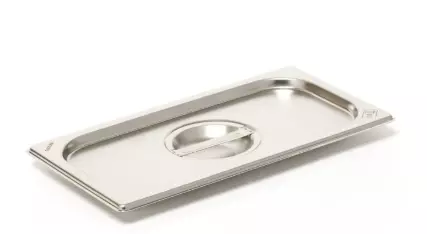 Couvercle en acier inoxydable de finition argent, dimensions 32,50 × 17,60 cm, épaisseur 0,70 mm, adapté aux bacs gastronormes 1/3.