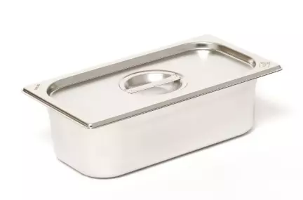 Placer sur un bac GN 1/3 après remplissage des plats. Pour le nettoyage, laver à l’eau tiède savonneuse, rincer et sécher. Ne pas utiliser d’abrasifs agressifs qui pourraient rayer la surface. Éviter les chocs violents. Stocker empilé ou séparé pour éviter les déformations.