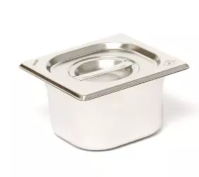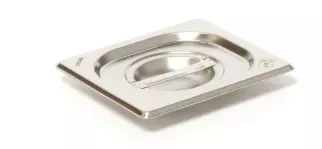 Couvercle en acier inoxydable pour bac gastronorme 1/6, finition argent, dimensions 17,60 × 16,20 cm, épaisseur 0,70 mm. Idéal pour couvrir et protéger les aliments en cuisine professionnelle.