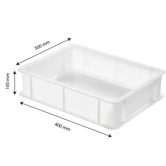 Demi-bac à pâtons blanc en PP, capacité 9 L, dimensions externes 400 × 300 × 100 mm, facile à empiler et à nettoyer, fabriqué en France.