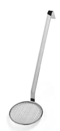 Ustensile de cuisine en acier inoxydable 201, tête en maille de 14 cm de diamètre, manche long de 67,5 cm, parfaitement adapté pour écumer ou égoutter aliments dans de grands volumes.