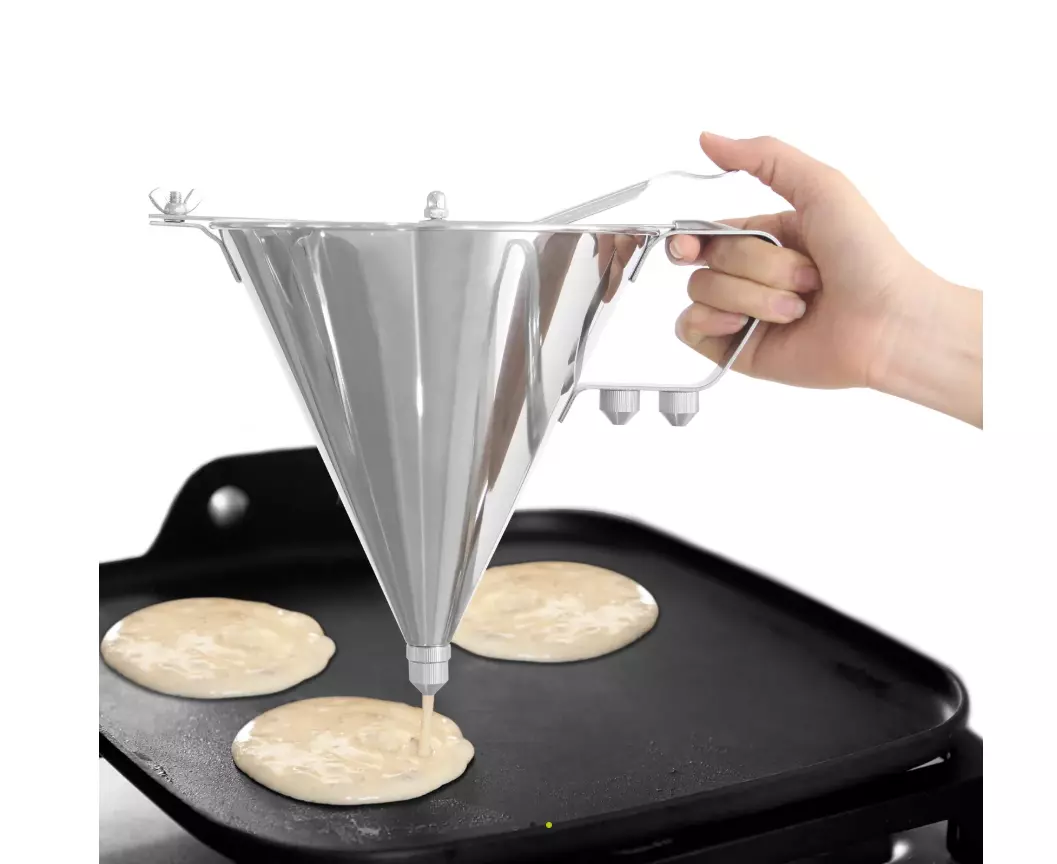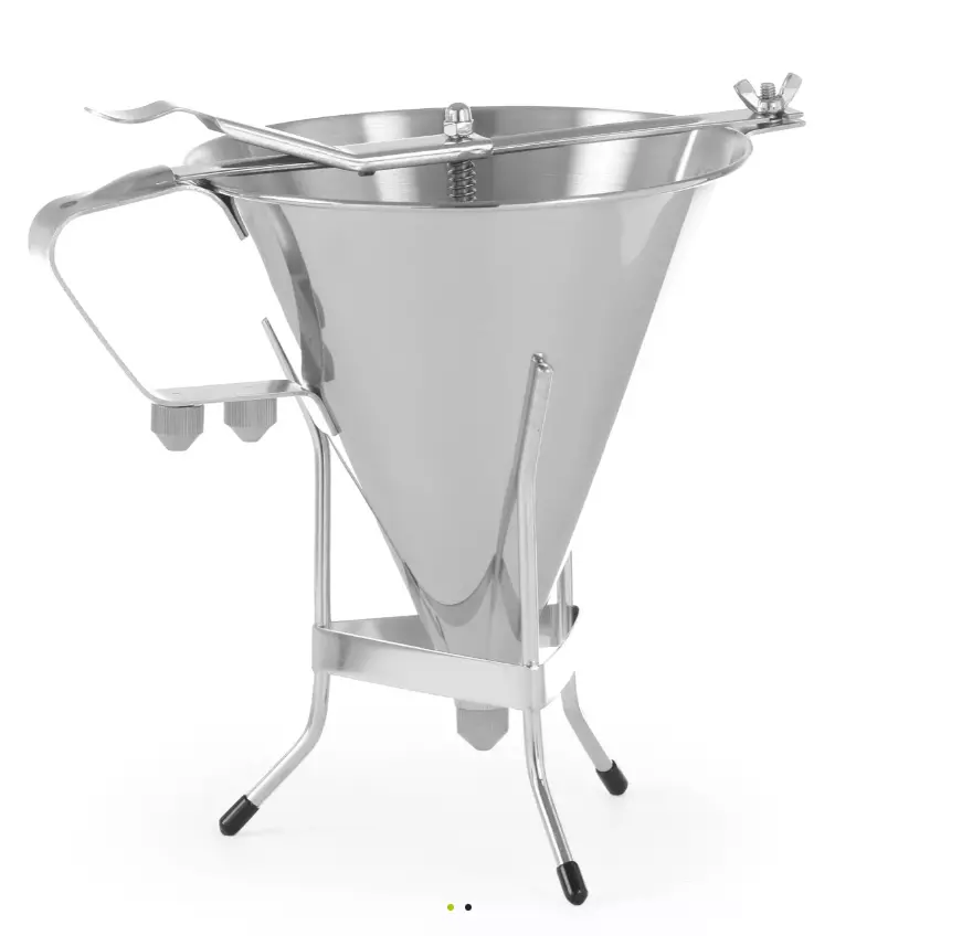 Entonnoir de dosage professionnel de 1,5 L, acier inoxydable 18/8, avec poignée ergonomique, trois embouts interchangeables (Ø 4, 5 et 6 mm), vanne étanche, et support filaire inclus.