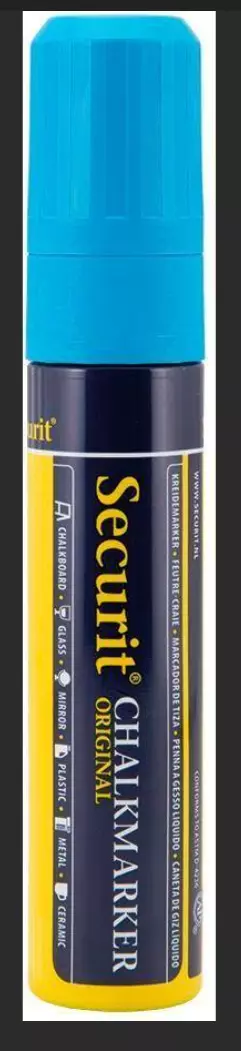 Marqueur craie liquide bleu vif, embout large biseautée 7–15 mm, offrant une écriture visible, résistante aux bavures et à la pluie légère une fois sec — idéal pour tableaux, vitrines, panneaux ou ardoises extérieures/intérieures.