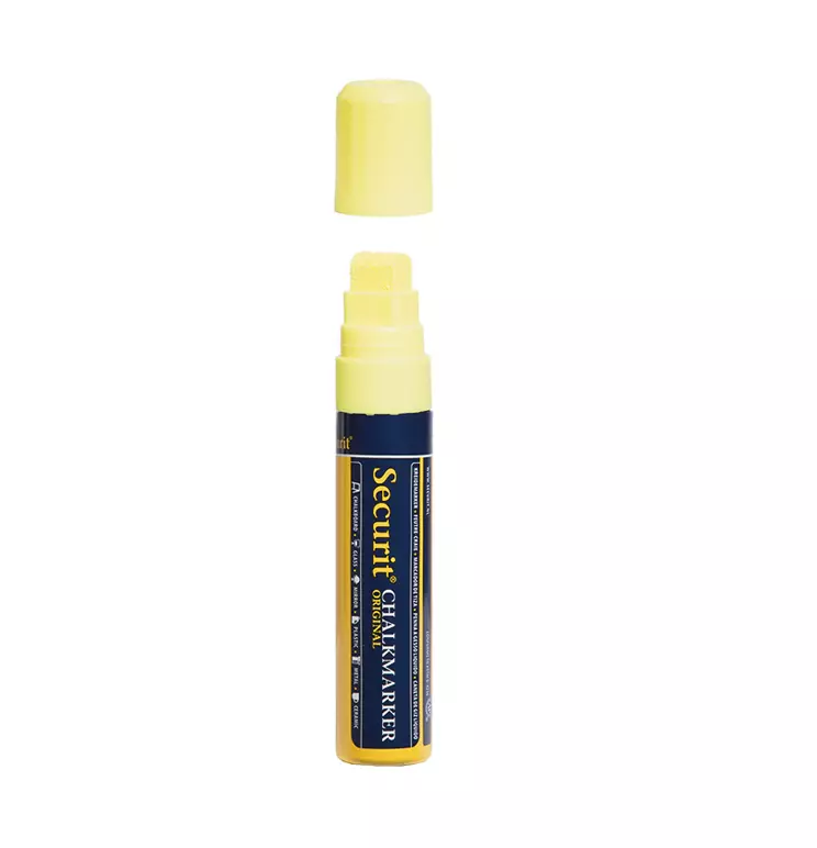 Marqueur à craie liquide jaune vif avec embout biseauté large (7–15 mm) — tracé net et lumineux, résistant aux bavures, à la décoloration et à la pluie légère une fois sec.