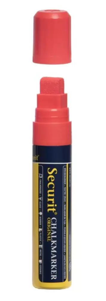 Marqueur craie liquide rouge vif avec embout biseauté 7–15 mm — tracé large et percutant, sec rapidement, résistant aux bavures, décoloration et pluie légère à l’extérieur une fois sec.