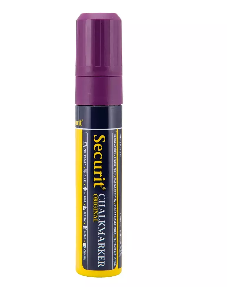 Marqueur craie liquide violet à embout biseauté large (7–15 mm), au tracé net et lumineux, résistant aux bavures, à la décoloration et à la pluie légère une fois sec.