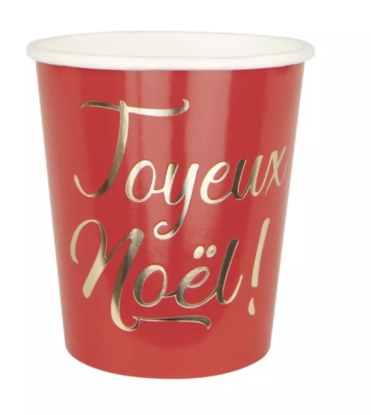 Jolis gobelets 300gr rouges avec "Joyeux Noel" écrit en doré