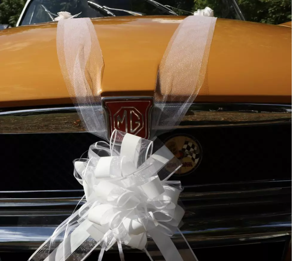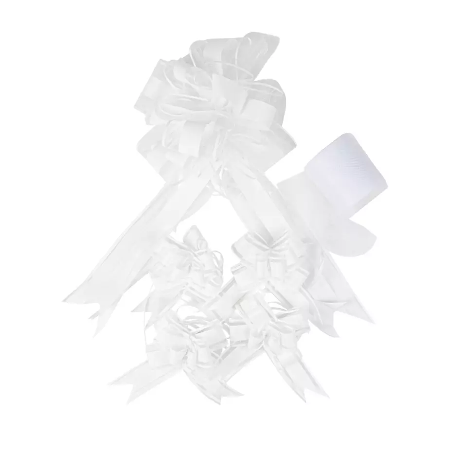 Accueil > ÉVÉNEMENTS > FESTIVITÉS > MARIAGE > Kit Déco de Voiture Blanc - 1 Gros Nœud 22x38cm - 4 Nœuds 10x13cm - 1 Ruban de Tulle 7cmx20m