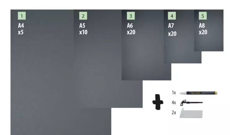 Lot de 20 étiquettes ardoise flexibles A7 (105 × 74 mm), double-face lavables, avec marqueur craie blanche et accessoires — parfaites pour signalétique de table, repérage ou personnalisations en restauration et événementiel.
