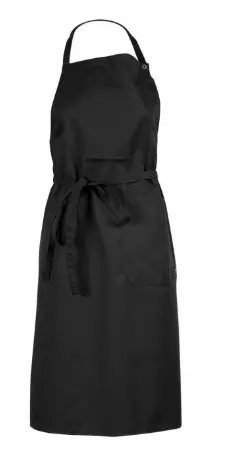 Tablier de service ou de cuisine à bavette, réglable, disponible en 13 coloris différents. Il inclut une poche stylo en haut, une poche basse sur le côté gauche, une ceinture de 110 cm et des boutons-pression pour ajuster le tour de cou.