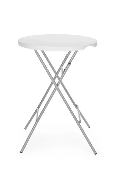 Table haute pliante multifonctionnelle avec plateau en HDPE blanc, structure en métal laqué, pour usage intérieur et extérieur. Dimensions Ø 800 × 1100 mm, capacité de charge jusqu’à 80 kg.