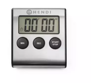 La référence **582022** de HENDI est un minuteur digital précis, conçu pour la cuisine professionnelle et domestique. Avec son format compact (65 × 70 × 17 mm), il se fixe à toute surface métallique grâce à son aimant ou se pose grâce à son support intégré. Il dispose d’un affichage numérique clair, jusqu’à 99 min 59 s, idéal pour surveiller la cuisson.