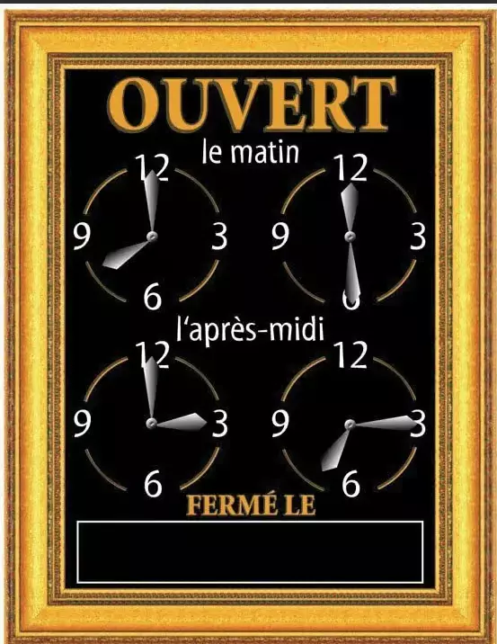 Panneau horaires + fil nylon – 15×20 cm – Noir et impression cadre doré – (À l’unité)