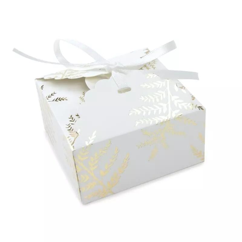 Jolies petites boites blanches festonnées, à dragées, à bonbons ou chocolats, avec un motif brins de fougère doré et un joli ruban. Parfaites pour un petit cadeau de table, et pour offrir un petit souvenir de l'évènement.