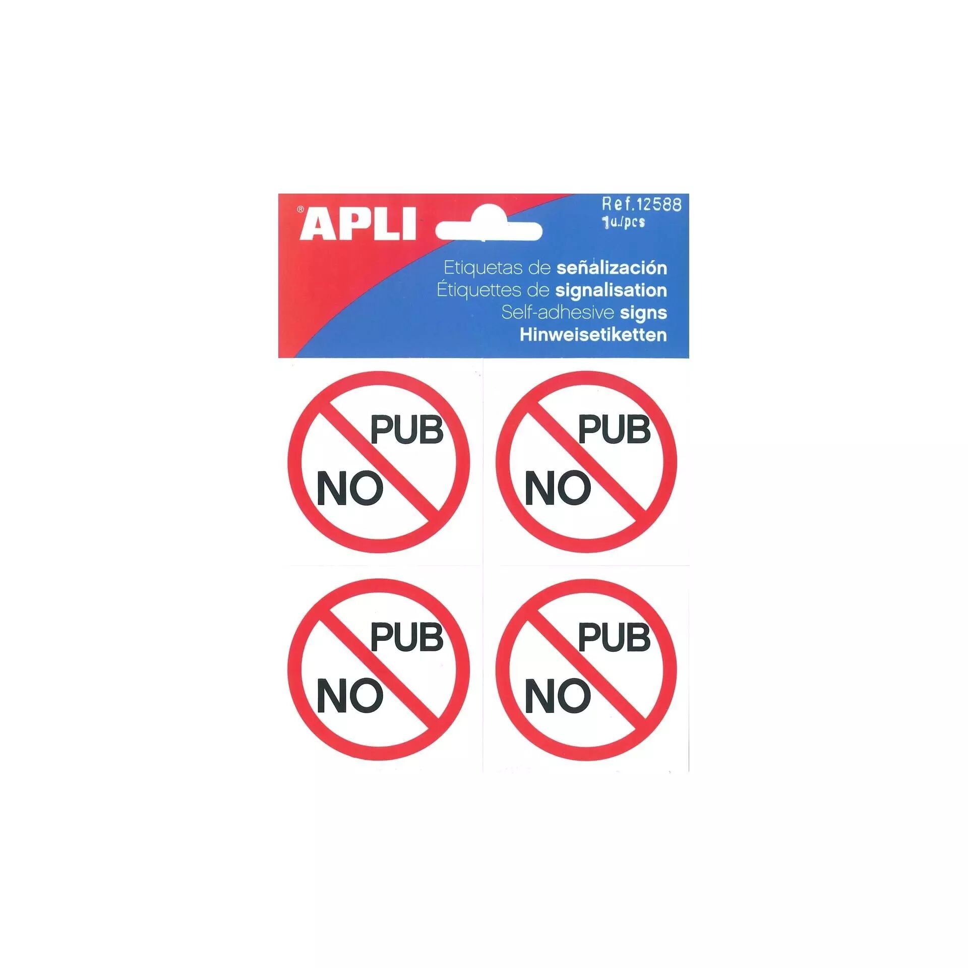 Etiquette de signalisation auto-adhésive no pub. En PVC : résiste à l'humidité. Adhésif permanent acrylique, à base d'eau. Présentation en pochette pegbordable, 4 étiquettes par pochette.