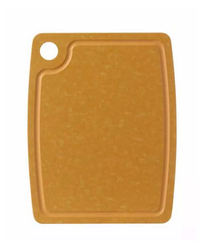 Planche en fibre de bois composite, couleur marron, dimensions 370 × 275 × 6 mm. Plus dense et durable que le bois traditionnel, dotée d’une rainure périphérique, pieds antidérapants, trou de suspension, compatible lave-vaisselle.
