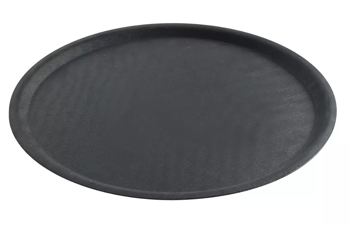 Plateau rond en polyester renforcé de fibre de verre, finition noire, avec surface caoutchoutée antidérapante – efficace à sec comme sous l’eau. Dimensions Ø 500 × H 22 mm, idéal pour usage intensif.