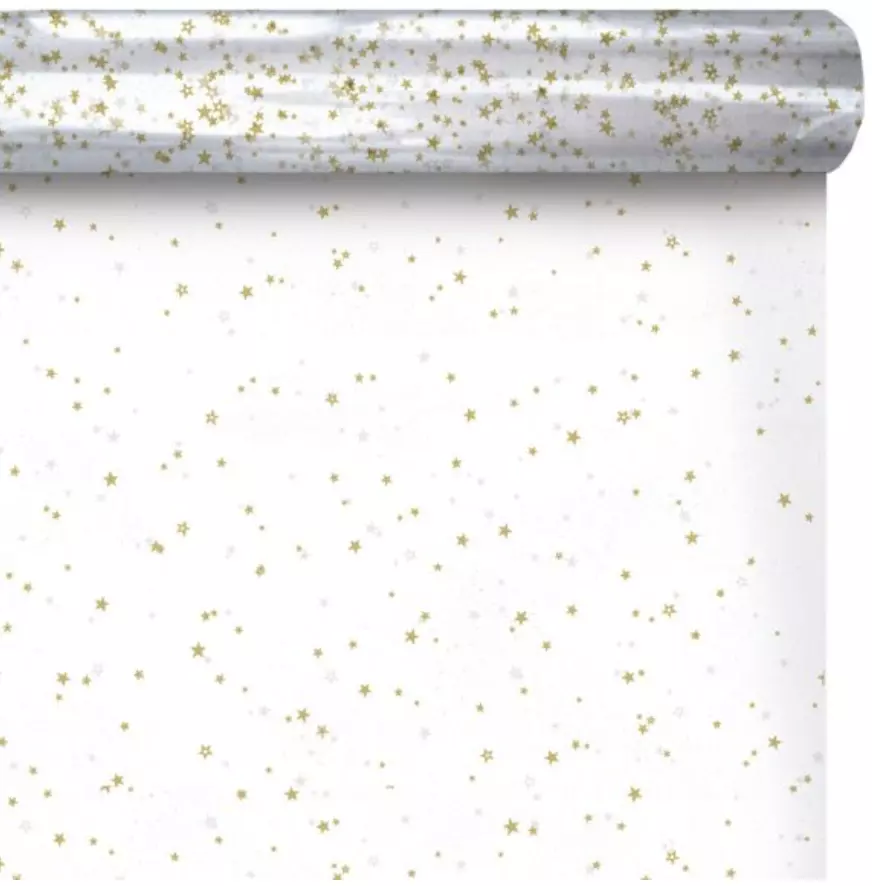 Rouleau d’emballage polypropylène doré à motifs étoiles, parfait pour sublimer vos paquets cadeaux et décorations de fin d’année.