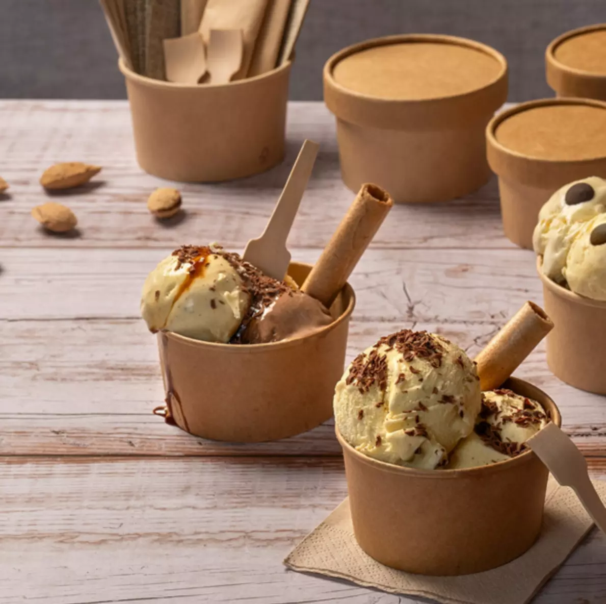 La référence **222.88** est un pot en carton brun recyclé/composable pour glaces, sauces ou snacks. Conditionné en 2 000 unités.