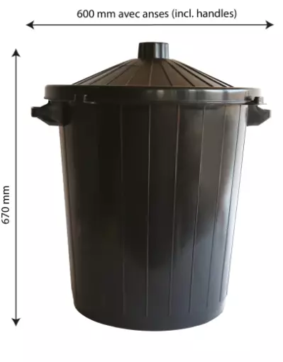 Grande poubelle extérieure robuste de 80 L, en polyéthylène recyclé, dotée de deux poignées de manutention et d’un couvercle verrouillable par quatre crochets. Conçue et fabriquée en France.
