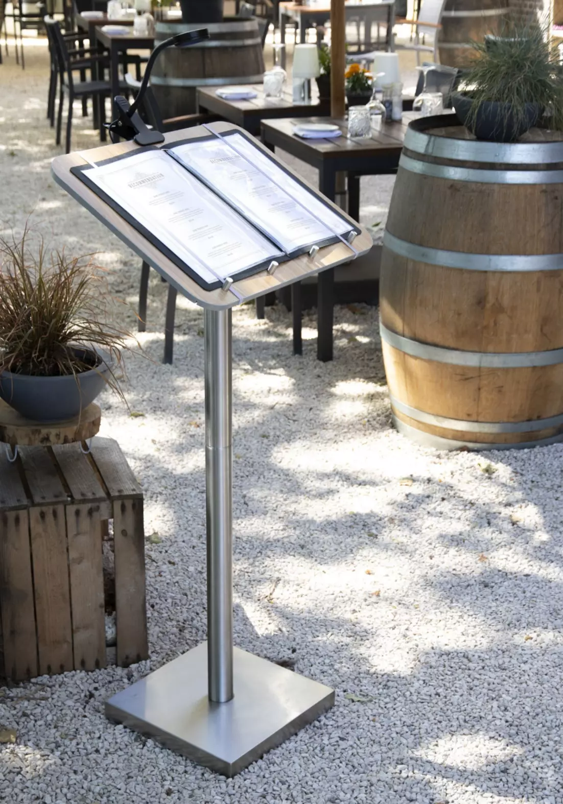 Élégant porte‑menu sur pied Securit®, associant plateau en bois teck et structure inox, doté de sangles élastiques pour maintenir les menus — parfait pour l’accueil professionnel.