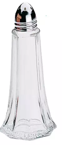 Salière en verre transparent de style “Tour Eiffel” avec couvercle chromé, capacité 30 g, dimensions 4,7 × 4,7 × 11 cm.