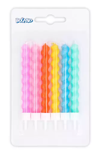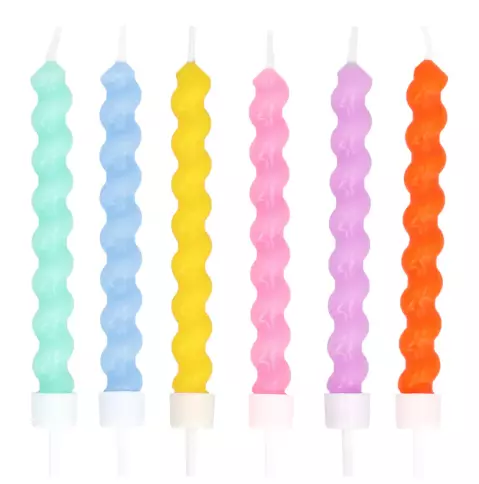 Coffret de 6 bougies décoratives “Swirl” en teintes pastel, hauteur 17,5 cm, diamètre environ 2,2 cm, finition torsadée élégante.