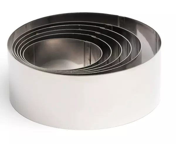 Ensemble de 6 cercles de moulage ronds en acier inoxydable 430, hauteur 4,5 cm, épaisseur 0,70 mm, usage pâtisserie et cuisine professionnelle.