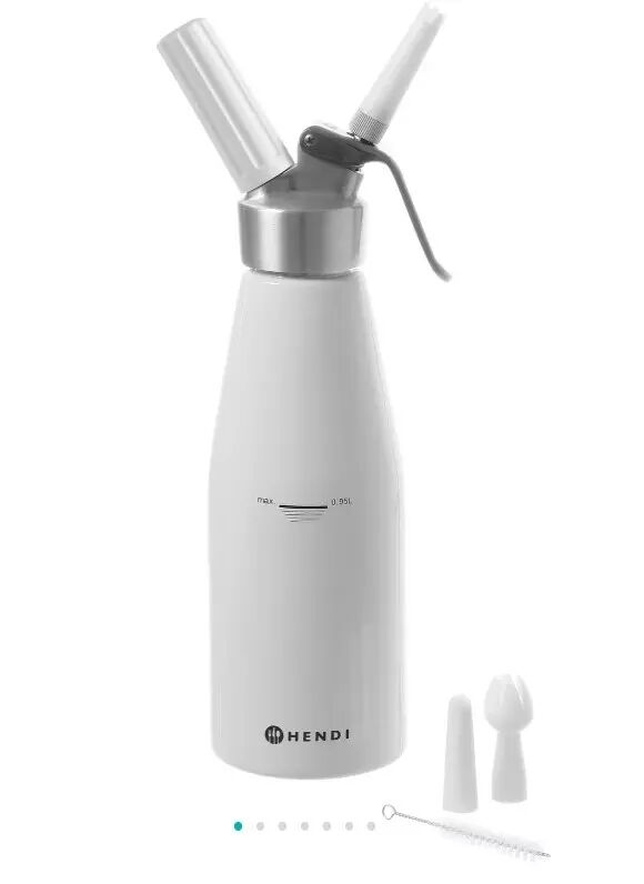 Siphon à chantilly en aluminium, capacité 0,95 L, livré avec 3 douilles en polypropylène, un porte-cartouche N₂O et une brosse de nettoyage. Ne convient pas aux préparations chaudes.