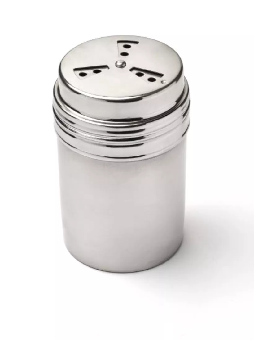 Saupoudreuse professionnelle en acier inoxydable, idéale pour saupoudrer uniformément farine, sucre glace, cacao ou autres poudres alimentaires sur vos préparations culinaires. Cette saupoudreuse compacte et résistante est adaptée à un usage quotidien tant en cuisine professionnelle qu’en pâtisserie.