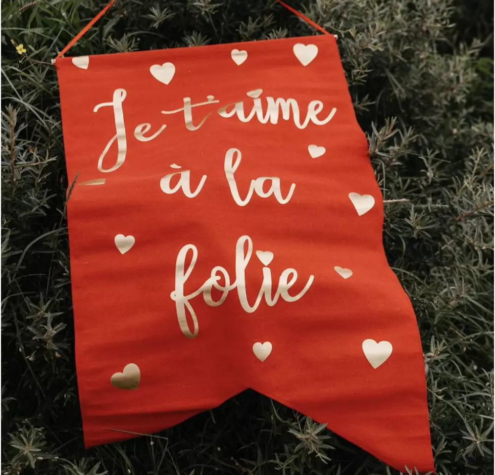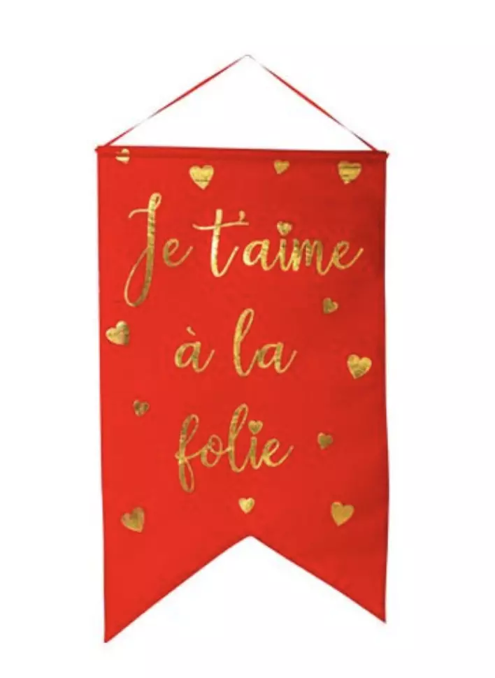Accueil > ÉVÉNEMENTS > FESTIVITÉS > SAINT-VALENTIN > Suspension Géante "Je t'aime à la folie" Effet Lin Rouge et Cœurs Or 51,5x87cm